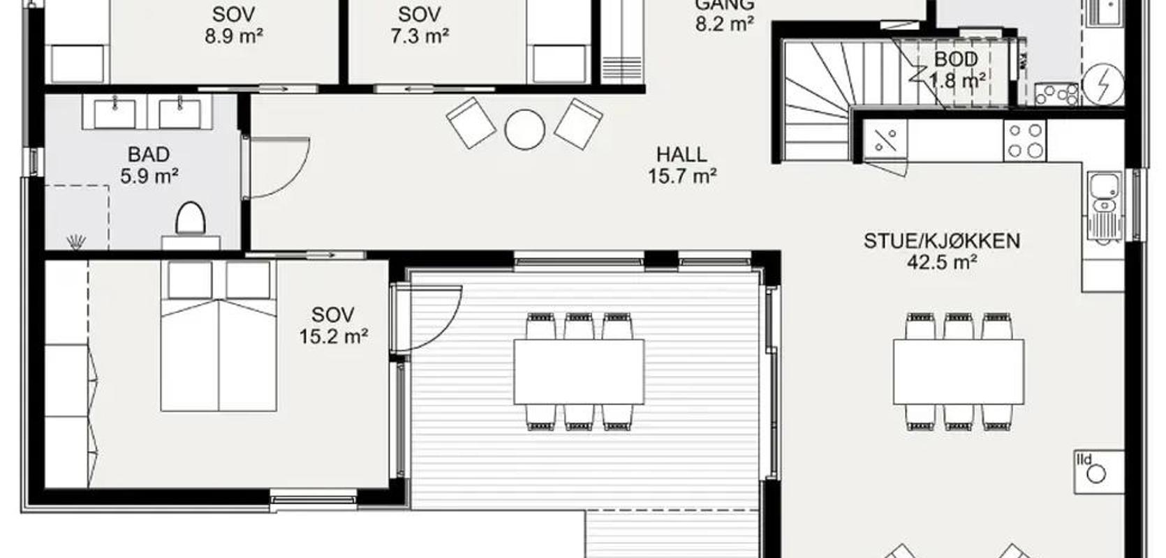 I hovedplanet finner man også et romslig inngangsparti hvor man har gjennomlys og god plass til garderobe. Inngangspartiet ligger lett tilgjengelig til gjeste-WC, samt et romslig vaskerom.